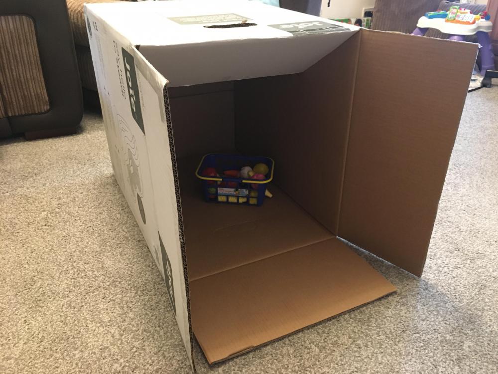 This is an activity that we have trialled recently, Theo is now 11 months old. Theo was tired one evening and I decided to try something different – we all know what babies are like, when they haven’t had an afternoon nap. I was hiding in the box and we ended up playing peekaboo, which Theo loves, he couldn’t stop laughing. There was a hole in our box so I kept putting my hand through, which again Theo found hilarious. He then started putting his hand through and posting different items through it.